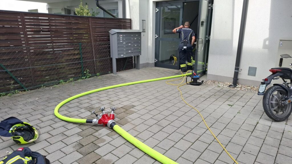 Nach erfolgter Wohnungsöffnung war schon dichter Rauch in der Wohnung sichtbar. Umgehend rüstete sich ein Atemschutztrupp aus und drang mit einer Löschleitung in die Wohnung vor. Kurz darauf konnte der Brandherd, ein mobiles Klimagerät, lokalisiert werden und abgelöscht werden.
