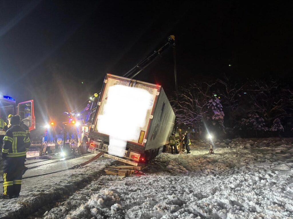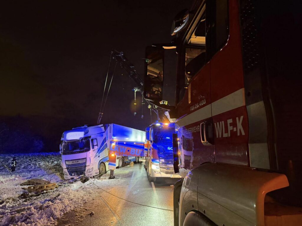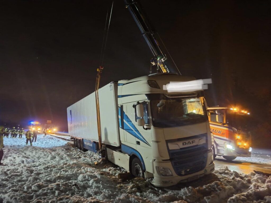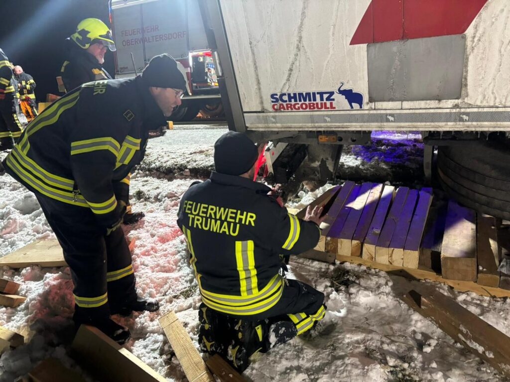 Da wir noch mit unseren Fahrzeugen bei den Bergungsarbeiten des ersten LKW unterstützten, kümmerten sich die Kameraden aus Oberwaltersdorf mit einen Fahrzeug zunächst um den Sattelzug vor der Ortseinfahrt und sicherten diesen gegen weiteres abrutschen.